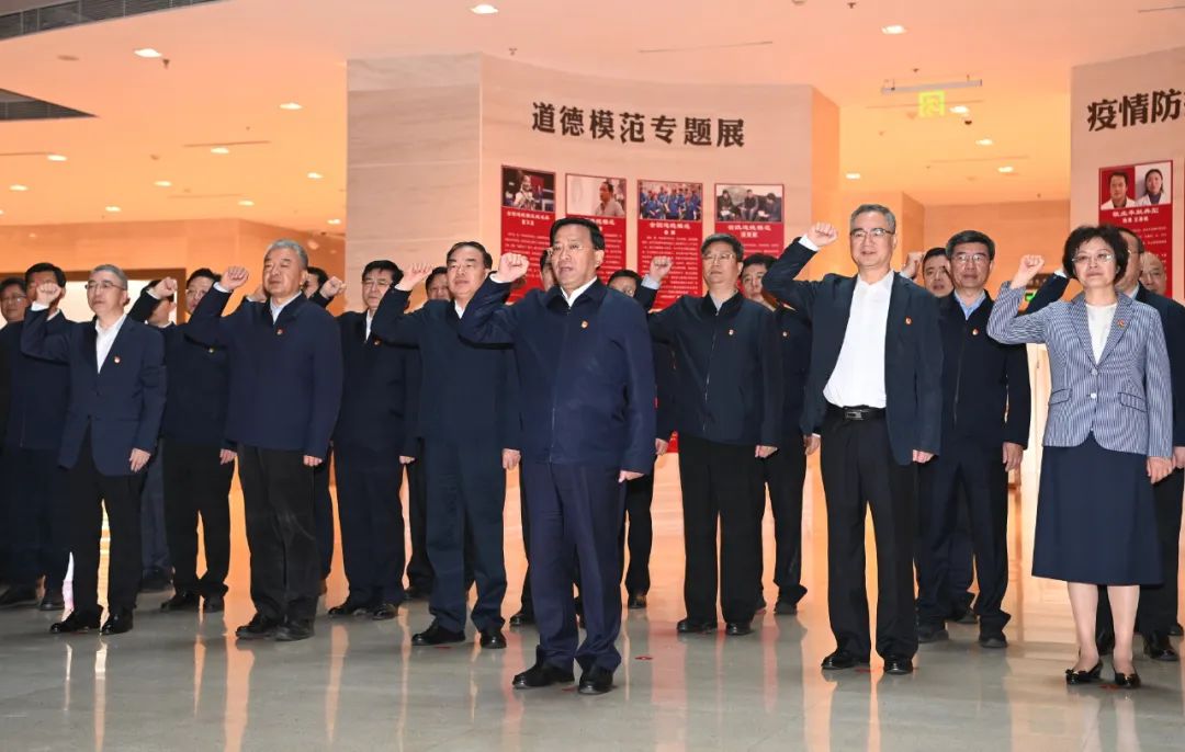 在一楼大厅,面向鲜红的中国共产党党旗,韩俊领誓,其他领导同志高举右拳,郑重宣誓,铿锵有力的誓言回荡大厅、激荡人心,表达了忠诚于党、忠诚于人民、忠诚于马克思主义的坚定信仰,展示了矢志不渝、接续奋斗的坚定信念,彰显了担当作为、奋勇前进的坚定信心。