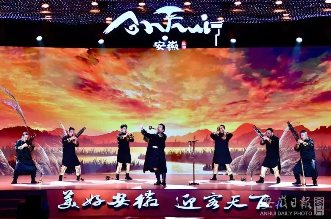 踏着青石板,一群徽州女子手提大红灯笼,翩跹而舞。开场舞蹈《寻梦徽州》,徽风皖韵扑面而来。千年宣纸、青砖黛瓦、温婉黄梅、悠扬徽剧、铿锵唢呐……彰显徽风皖韵的华美乐章,为四海宾朋奉献了一场视听盛宴,以精妙绝伦的艺术语言呈现安徽山水人文之美。