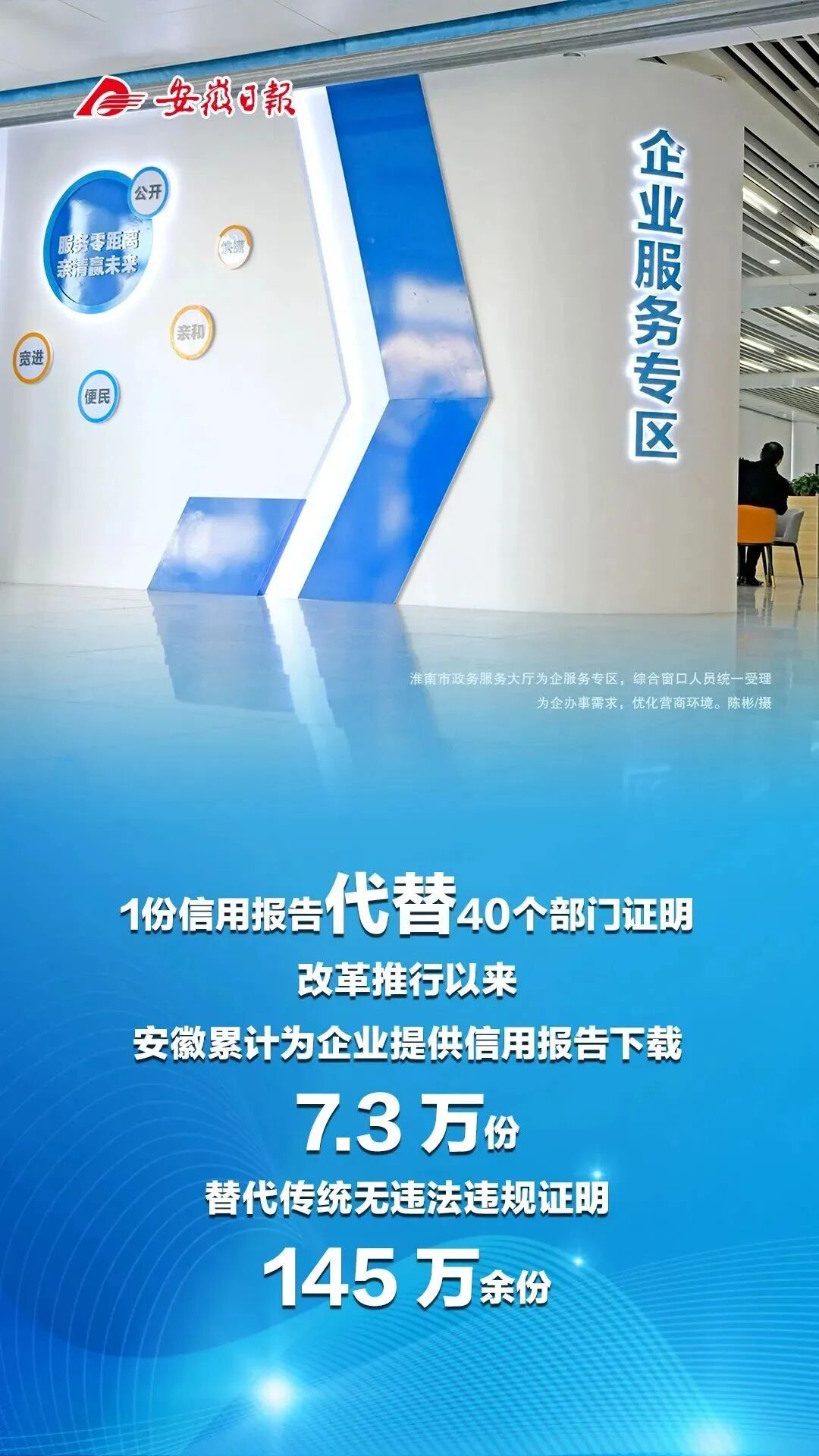 自2023年3月改革实施以来,我省已累计为企业提供信用报告下载7.3万份,已替代传统无违法违规证明145万余份,较好做到“数据多跑路,企业不跑腿”,全国多个省份来安徽主动对接调研,并拟借鉴推广。