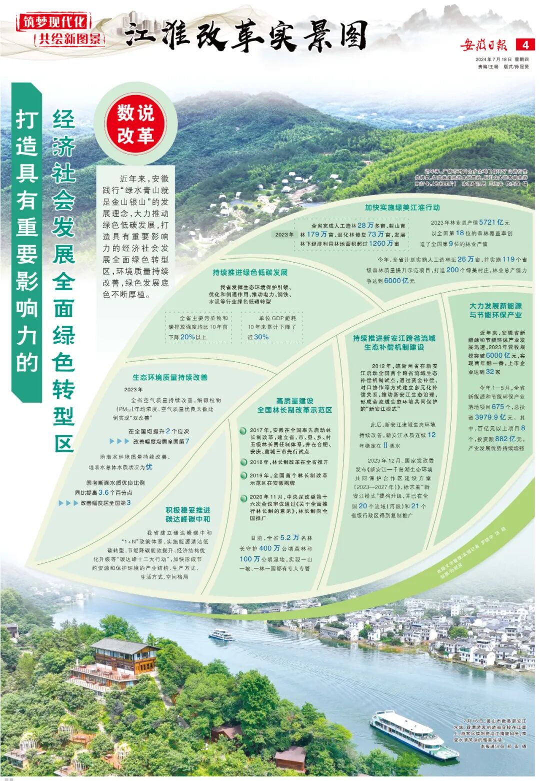■近年来,安徽践行“绿水青山就是金山银山”的发展理念,统筹推进降碳、减污、扩绿、增长,打造具有重要影响力的经济社会发展全面绿色转型区,环境质量持续改善,高质量发展底色不断厚植。