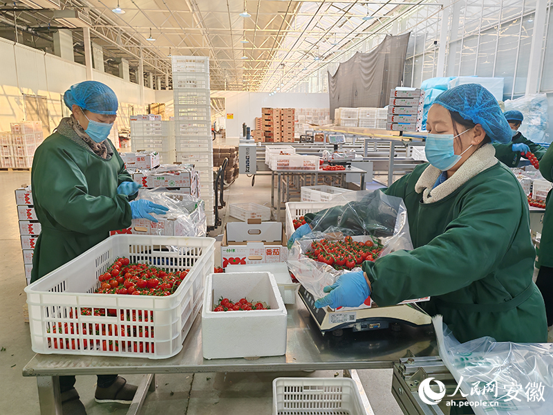 走进宿州拂晓现代农业科技示范园,映入眼帘的是一派繁忙景象:工人们正娴熟地将一串串缀满藤蔓的小番茄采摘、分拣、包装。这些色泽鲜亮的果实即将装车,发往皖北及江苏地区的各大商超。