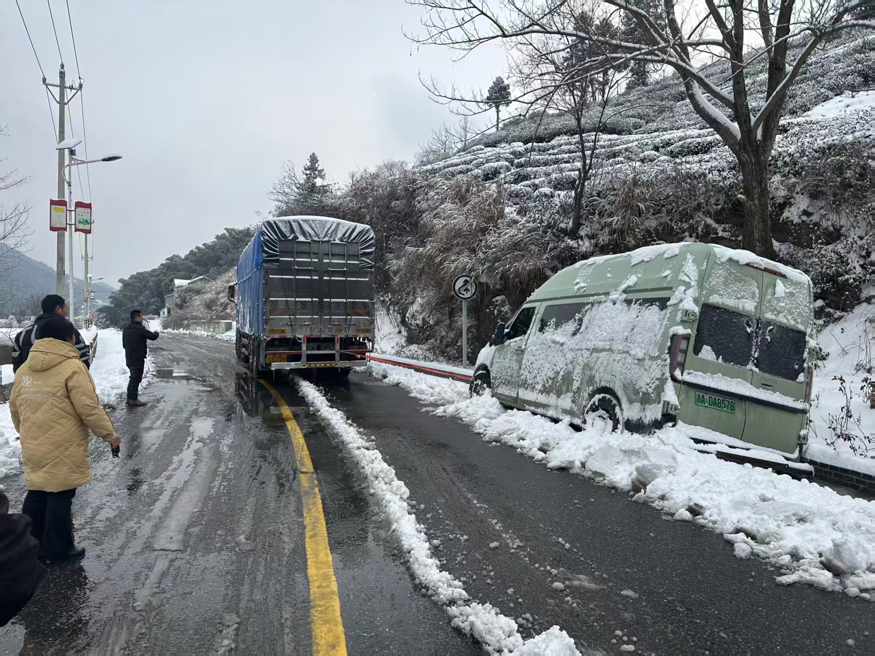 “找车子拉!”吴亚龙拦下一辆过路货车。牵引绳一次次绷紧、断裂,雪深路滑,救援再次失败。