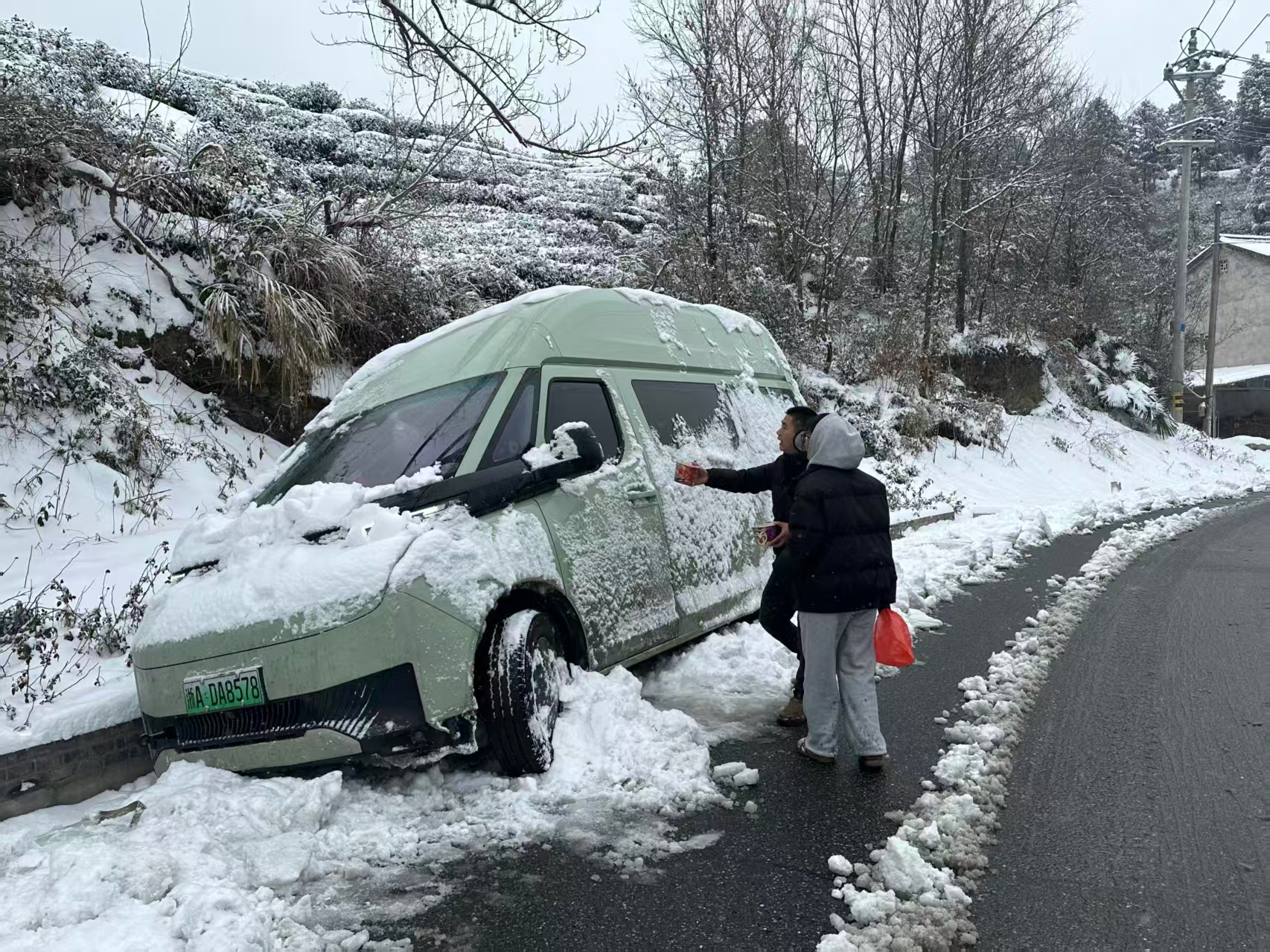 寒夜深沉,雨雪交加,气温已骤降至零下。电动车电量渐耗,夫妻俩不敢启动暖气,只得在刺骨寒冷中等待天明。