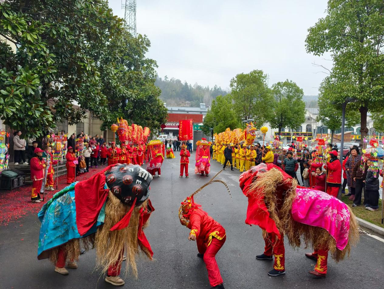 鼓点催征,龙狮劲舞展雄风。喧天的锣鼓声划破山乡宁静,两条彩色长龙翻腾起舞,时而昂首盘踞,时而穿梭游走;六只雄狮紧随其后,腾挪跳跃、摇头摆尾。铿锵的鼓点、翻飞的龙身、灵动的雄狮,汇成一股热浪,点燃了围观群众的热情。这份舞在春风里的“精气神”,正是山乡儿女奔赴好日子的滚烫宣言。