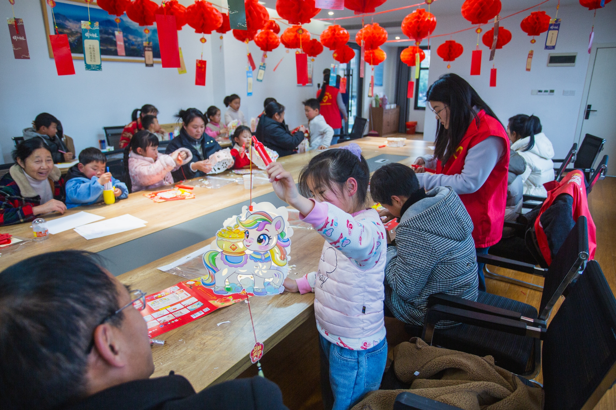 在“巧手做花灯”环节,志愿者向小朋友分发手工灯笼DIY材料包,现场演示制作步骤,并手把手指导家长与孩子共同创作。家长与孩子默契配合,认真折叠、穿绳、粘贴、装饰,不一会儿,一盏盏色彩斑斓、造型别致的花灯便陆续完成。制作完成后,孩子们提着自己亲手制作的花灯,脸上洋溢着满满的成就感,现场气氛温馨而热烈。活动最后,大家手提花灯、怀抱汤圆,共同合影留念,定格下这美好的节日瞬间。每一位参与者都收获满满,真切感受到节日的温暖与关怀。