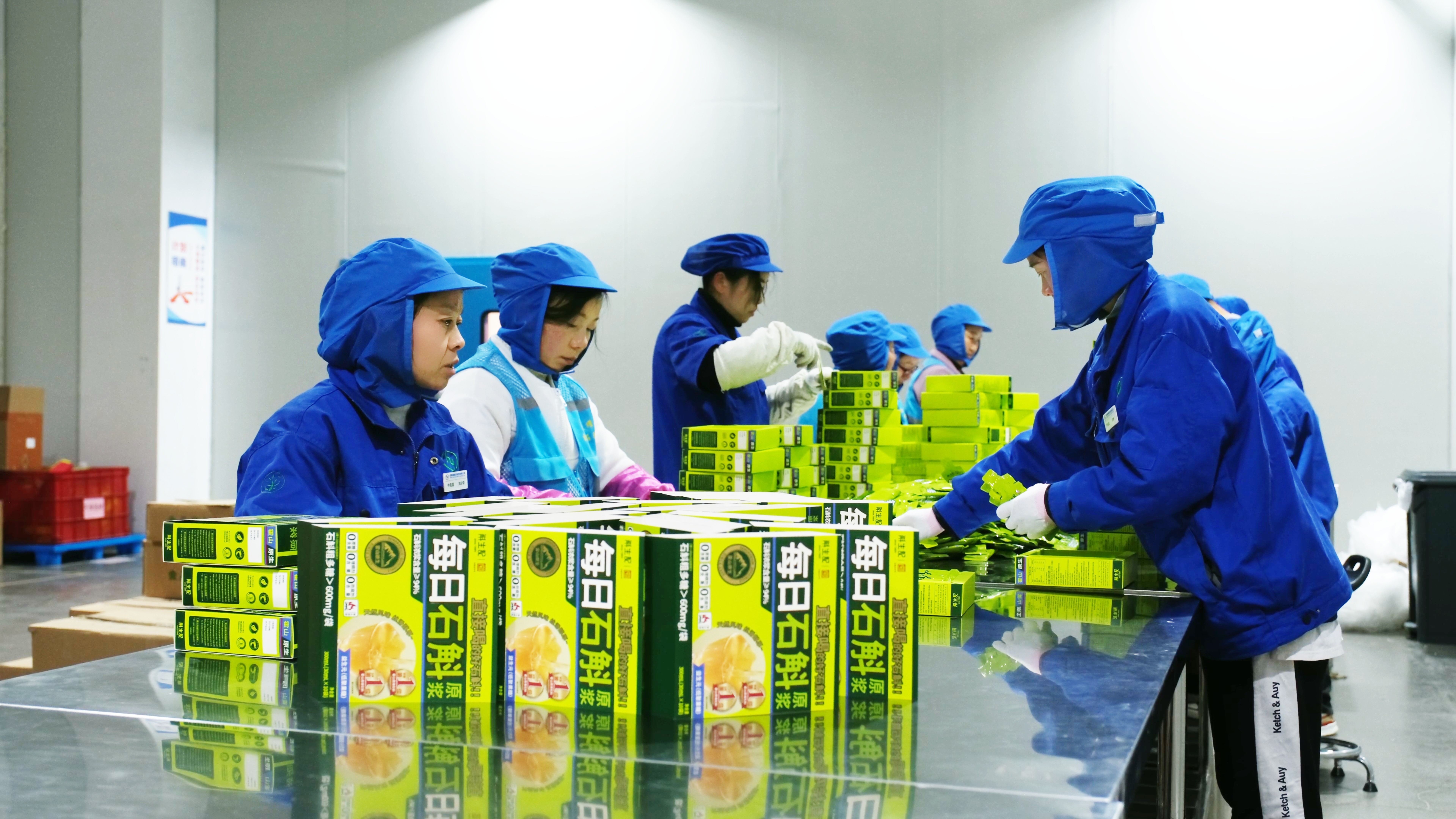 霍山高端智慧产业园,徽耀供应链有限公司的生产车间里,自动化生产线高速运转。一袋袋石斛原浆封装整齐,准备发往全国各地。